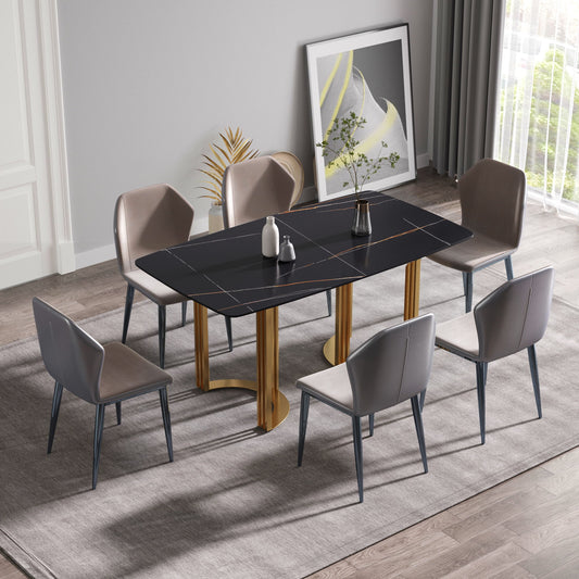 63" Modern Artificial Stone Curved Golden Metal Leg Dining Table, 6 People - Black / Gold