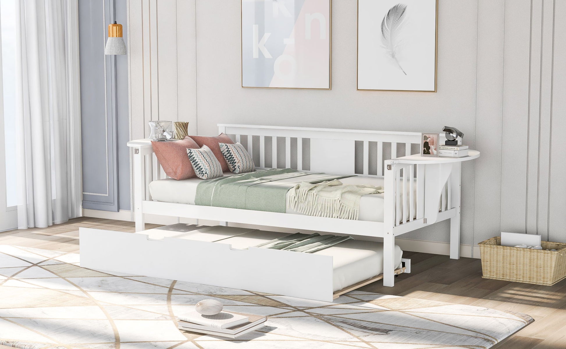 Multi-functional Design: The daybed frame with rails on three sides can serve as a bed in your bedroom, or as a sofa or seat in your living room. With small, foldable tables on the left and right, you can conveniently place a cup of coffee or a book within reach. It perfectly meets your different needs.