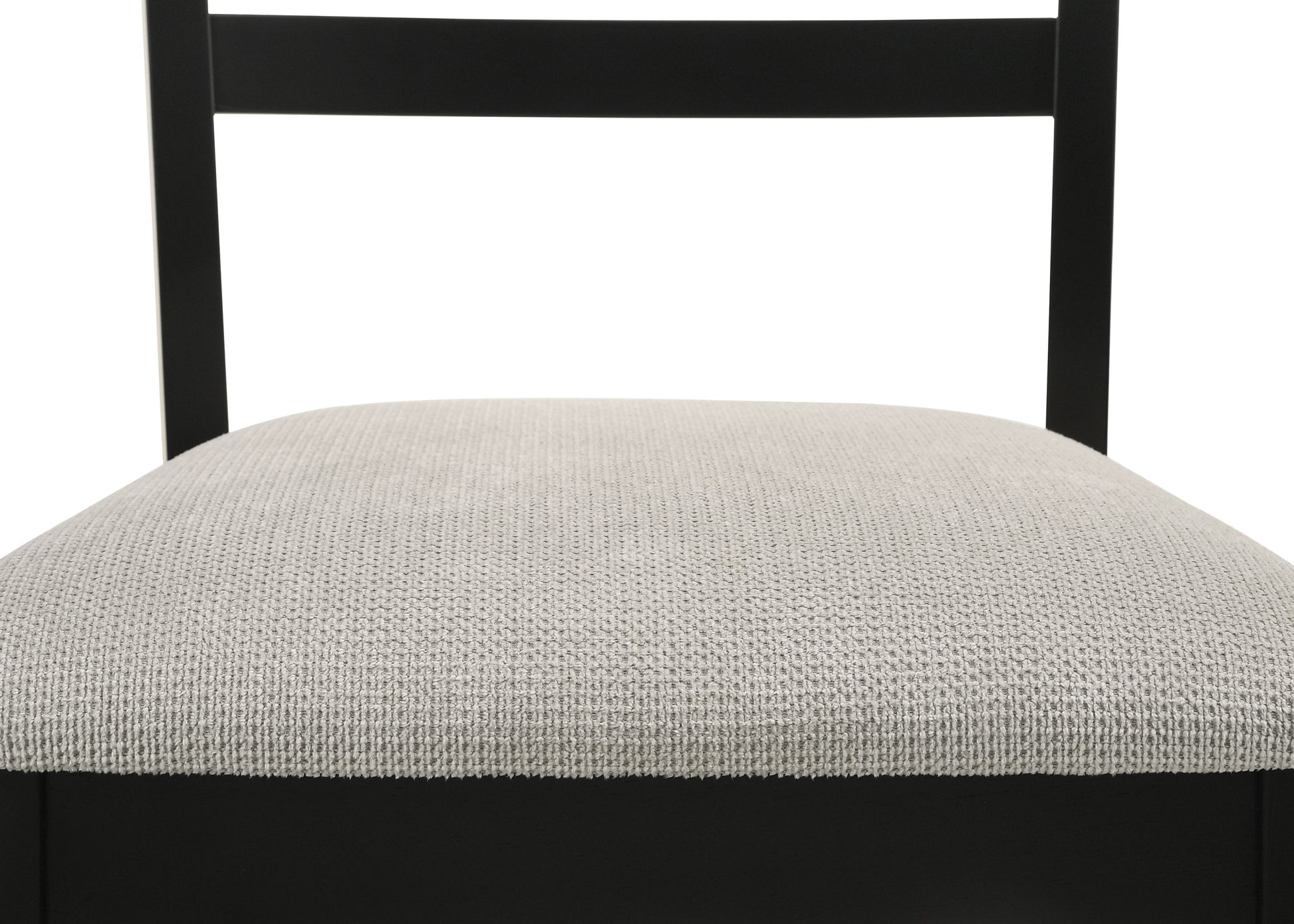 This dining group is the epitome of modern sophistication and functional elegance. The centerpiece is a sleek, rectangular table with a beautifully textured wood grain finish, offering a touch of rustic charm to its contemporary design. The table is complemented by a set of four ladder-back chairs and a versatile bench, all featuring a deep black frame that provides a striking contrast to the neutral, upholstered seats. The cushioned seating ensures comfort, while the bench adds flexibility and a communal feel, perfect for both family meals and entertaining guests. The overall design is enhanced by clean lines and a minimalist aesthetic, making this set a stylish focal point for any dining space.