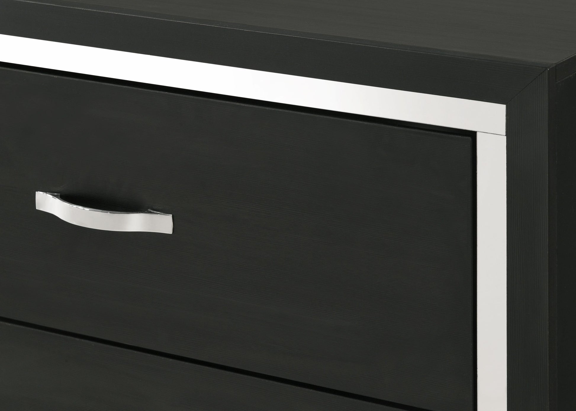 This bedroom collection strikes a balance between bold and classic styles. It features a striking bed with a high, textured headboard that commands attention. The accompanying case goods, including a dresser with a mirror, chest, and nightstand, are all finished in a sharp, black hue that adds depth and modernity to any bedroom. Each piece is accented with sleek metal handles that contrast beautifully against the dark finish. The clean lines and uncluttered design of the furniture allow for versatile placement in a variety of interior styles, from contemporary to transitional.
