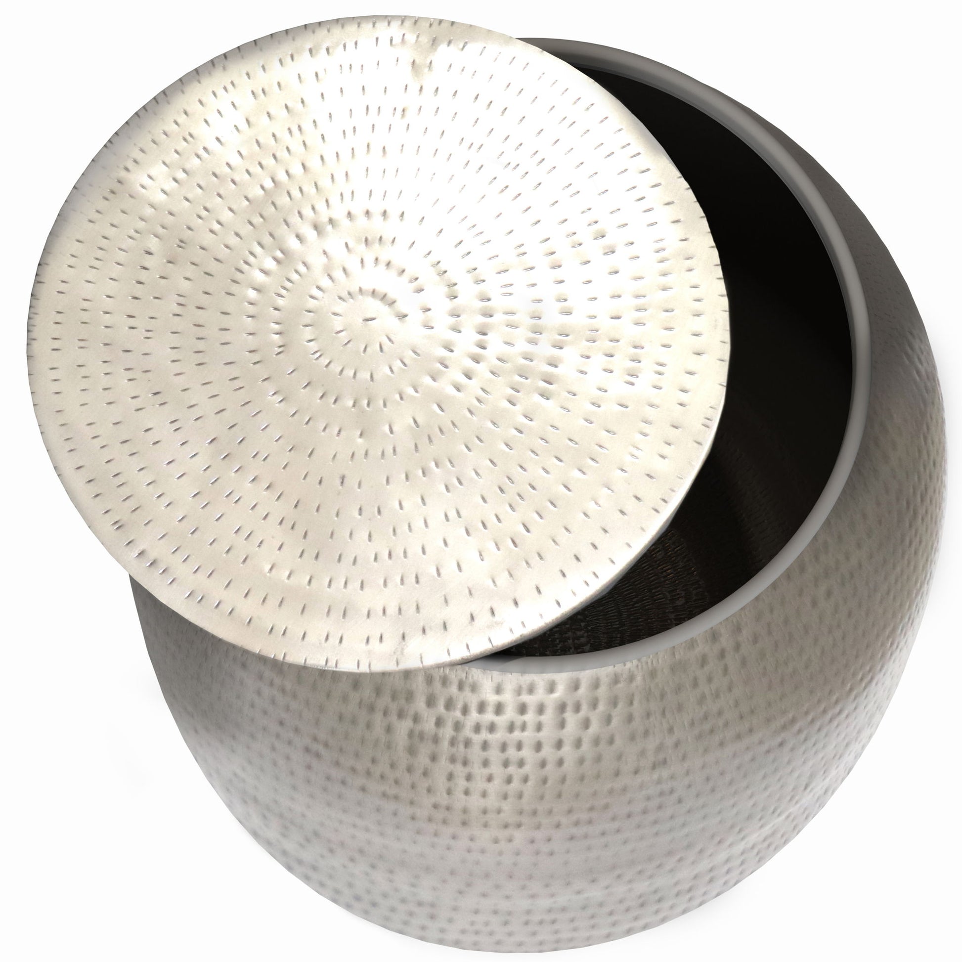- Features hand hammered detail, Large drum shape with removable top that reveals plenty of storage