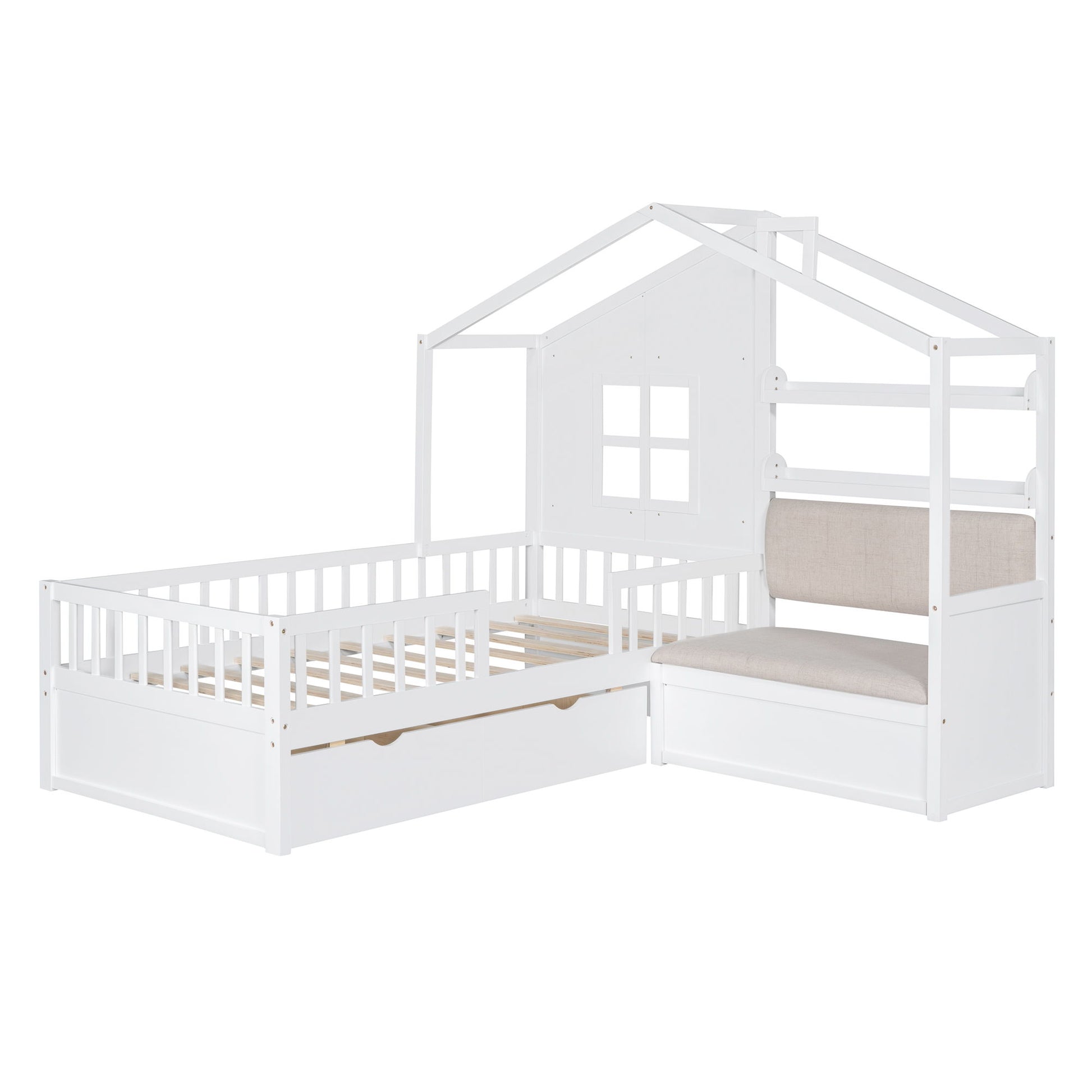 Twin Size House Bed With Sofa, Kids Platform Bed With 2 Drawers And Storage Shelf - White