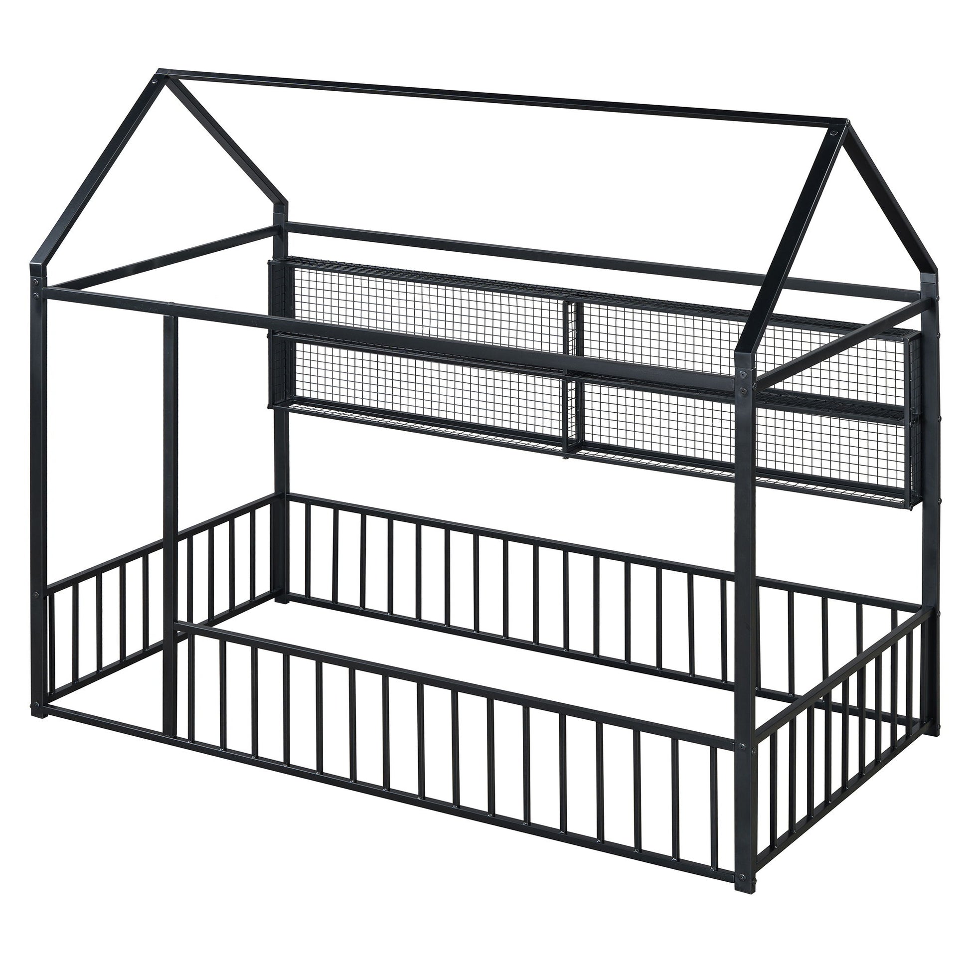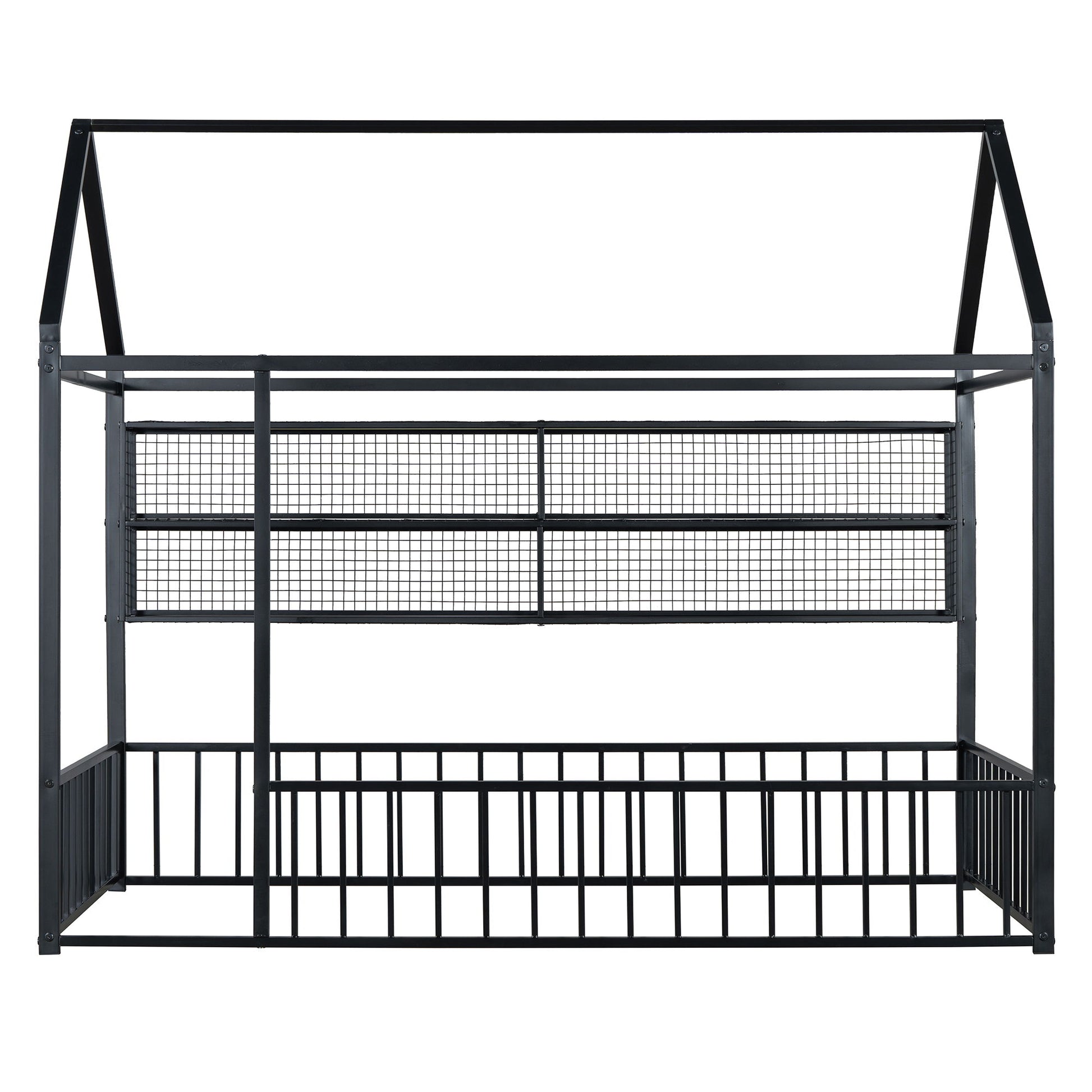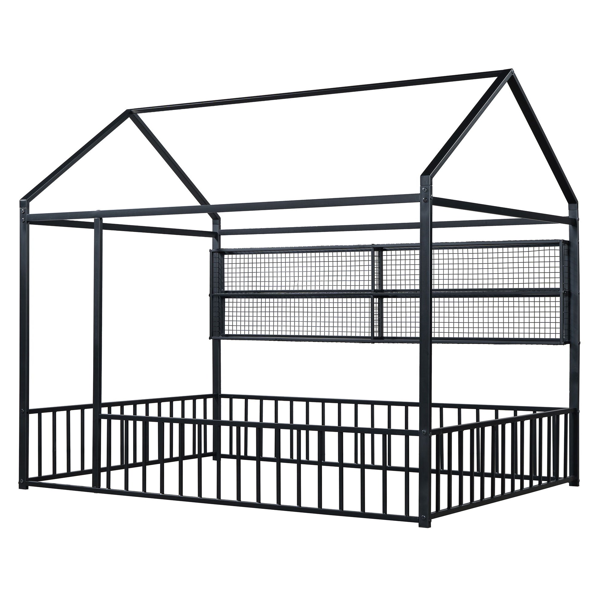 Full Size Bed House Frame With Fence And Shelves - Black