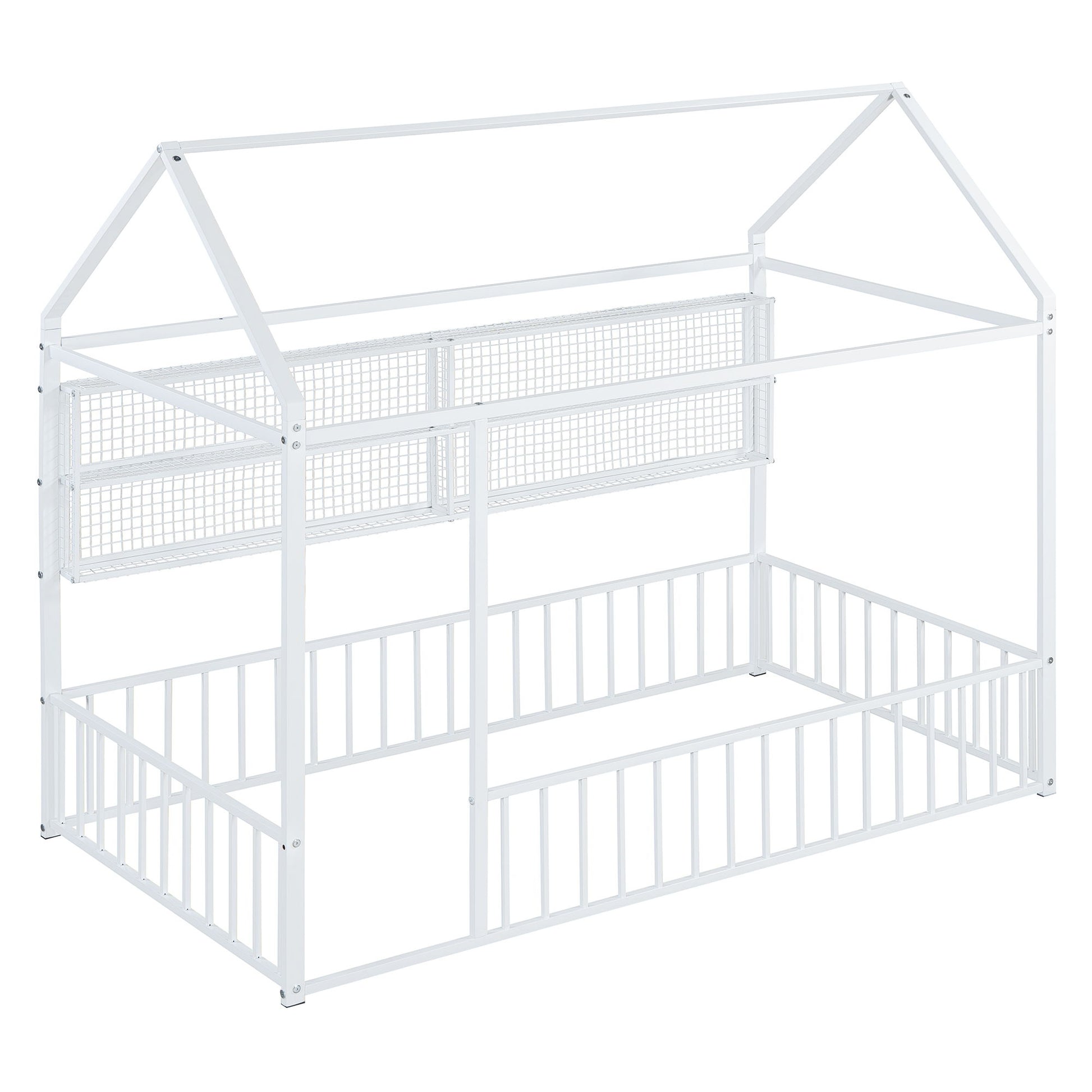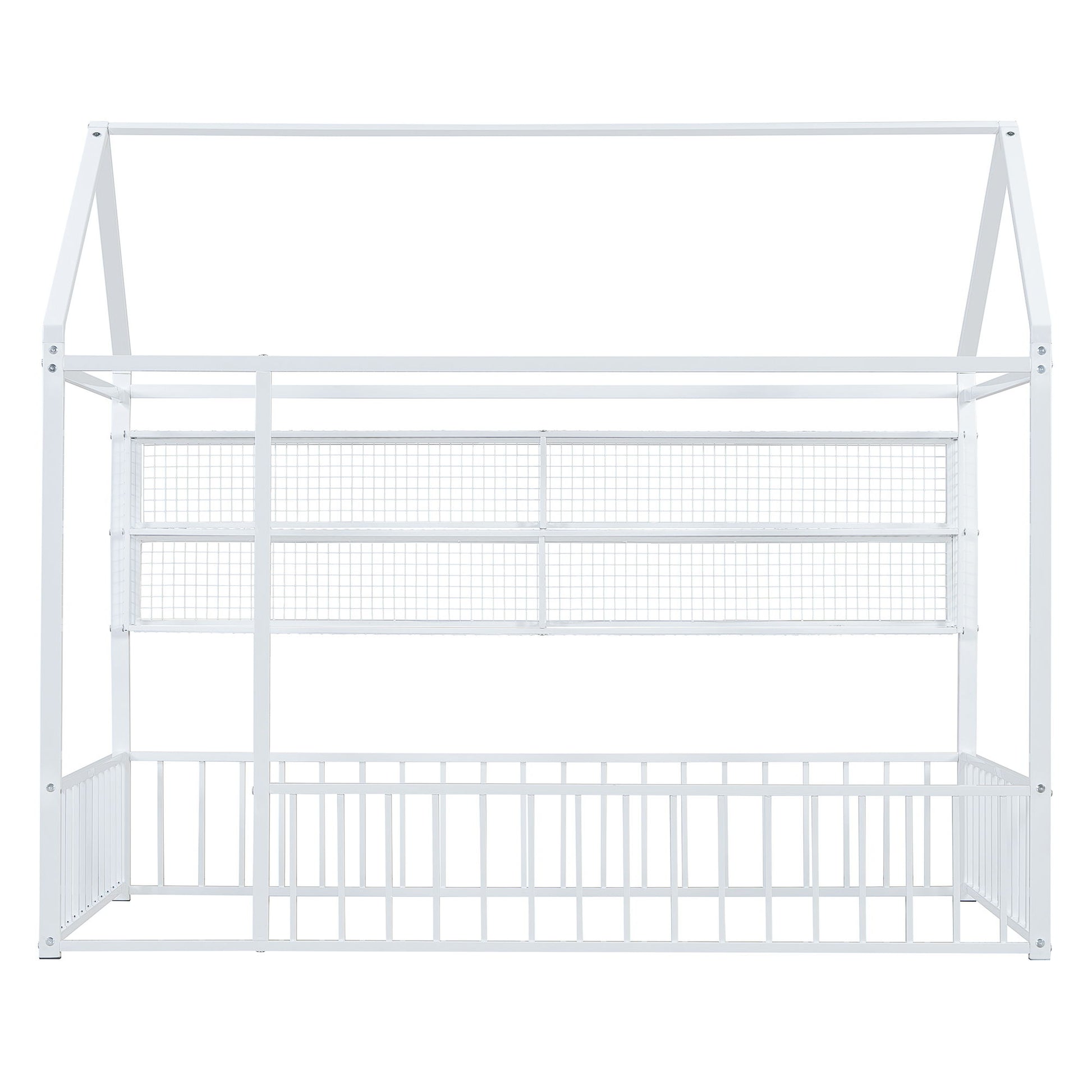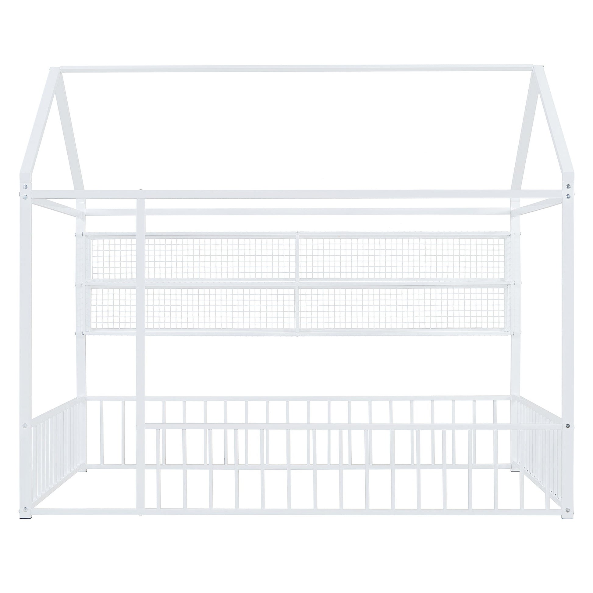 This stylish metal bed frame features a unique house-shaped design, adding a playful yet modern touch to any bedroom. With sturdy metal construction, it ensures long-lasting durability and a secure night's sleep. The back of the bed is equipped with four convenient metal grid shelves, providing extra storage for your essentials while maximizing space. This bed frame blends functionality with a whimsical design, making it a standout piece in any room.