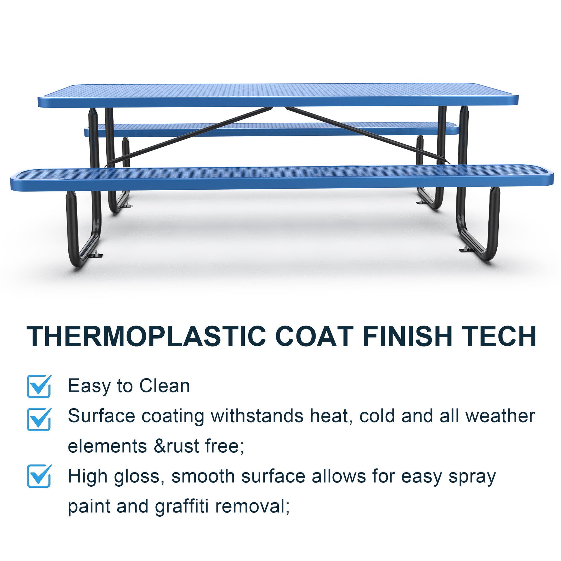 - Stable Steel Frame: The picnic table and chair top are crafted from industrial-strength steel, coated in thermoplastic for durability, and feature galvanized frames with a heavy-duty powder coat finish to withstand harsh weather conditions.