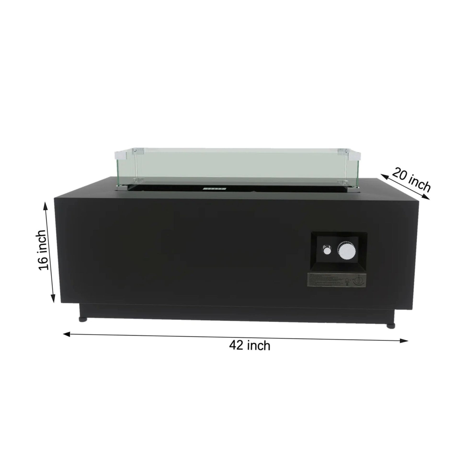 - Modern Design: This fire pit table features a sleek, modern design that enhances the aesthetics of your patio or balcony. Its clean-lined, rectangular shape is complemented by the transparent glass shields that add a touch of elegance while diffusing the firelight.