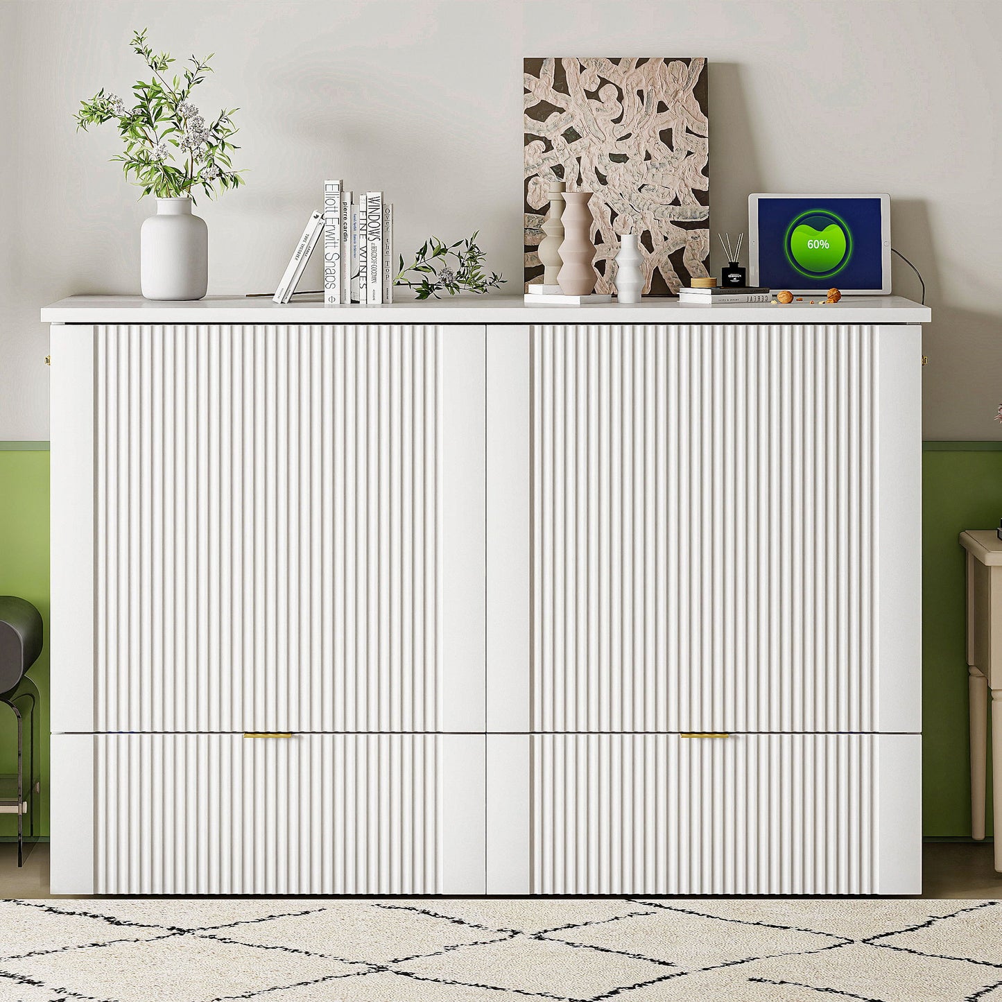 Queen Size Murphy Wall Bed With Drawer And A Set Of Sockets & USB Ports, Pulley Structure Design - White