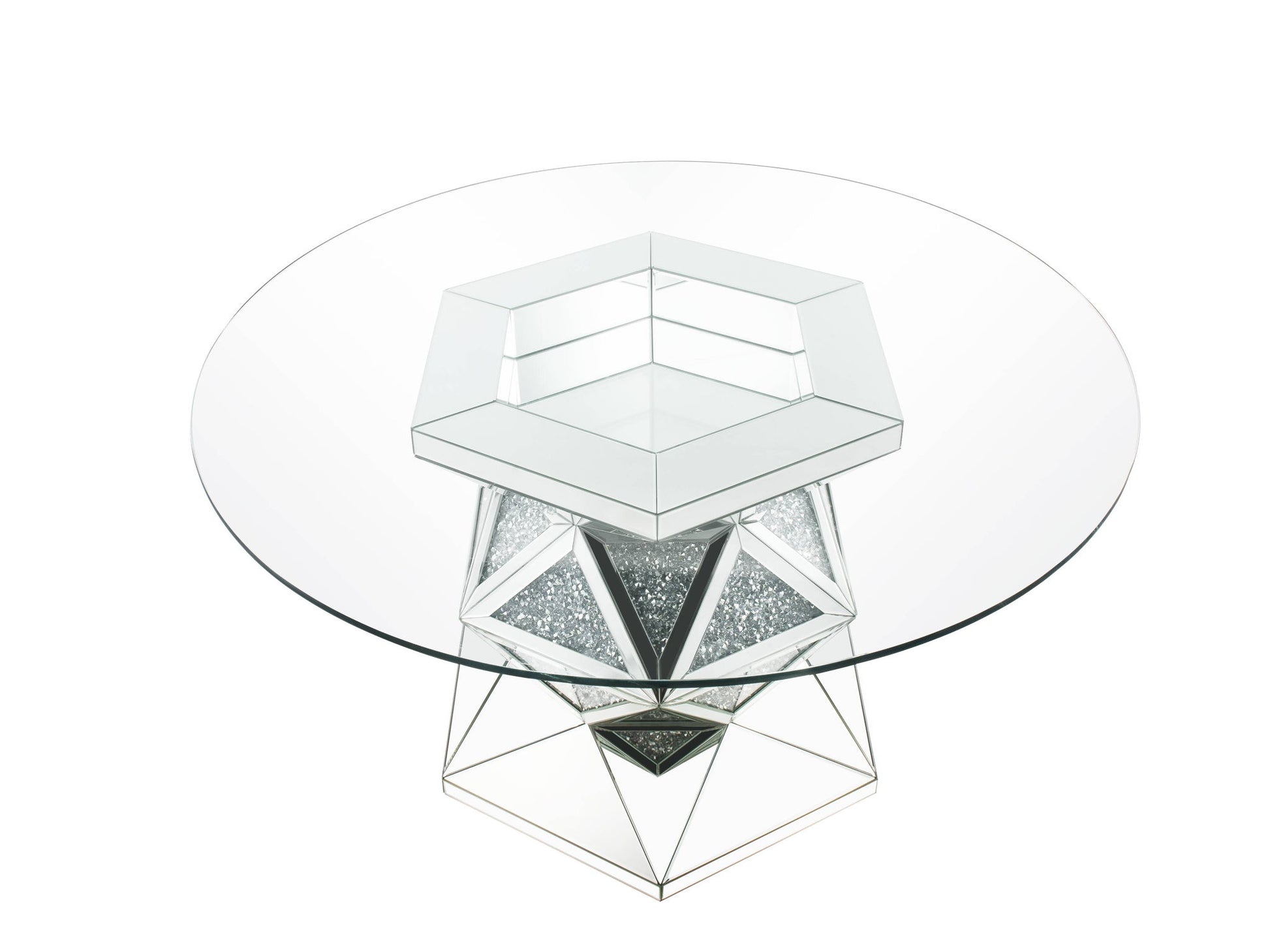 - Stunning Design: This dining table boasts a 12mm clear tempered glass top and a mirrored single pedestal base, serving as a luxurious centerpiece for any dining area.
