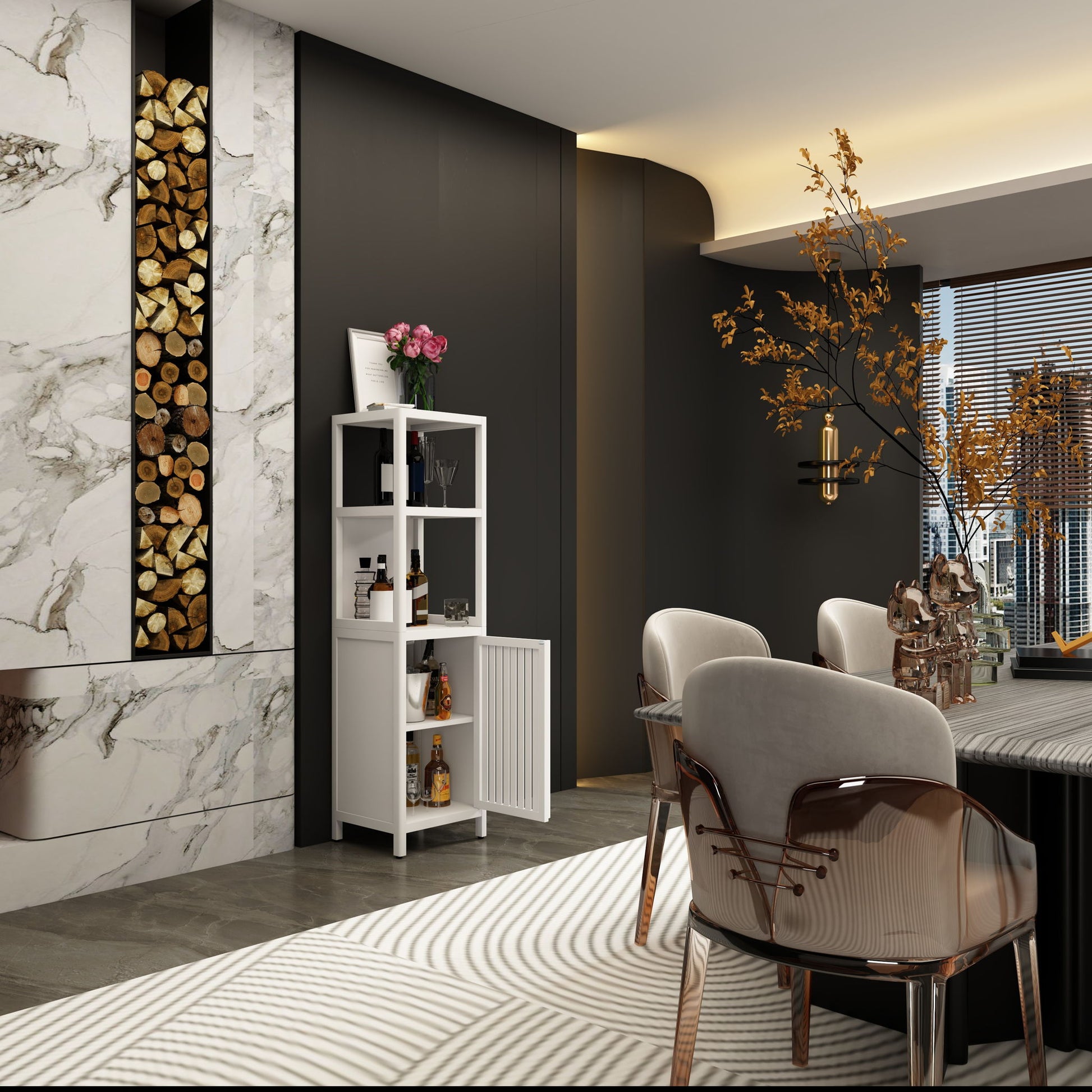 - Practical Storage Space: Maximize your space with 2 open shelves and a cabinet with doors, perfect for small corners.