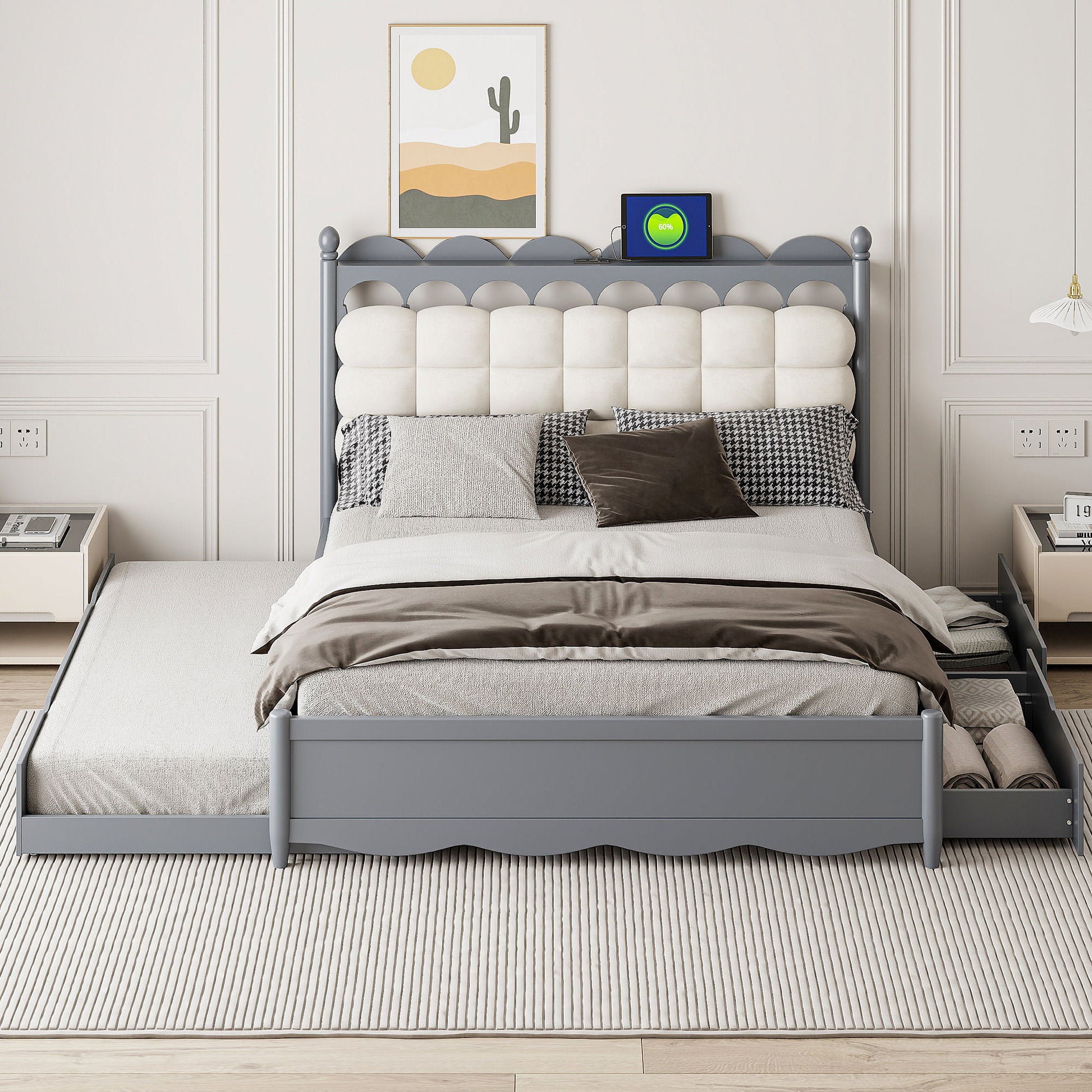 Storage Platform Bed, With 2 Big Drawers, Trundle, One Set Of Sockets & USB Ports
