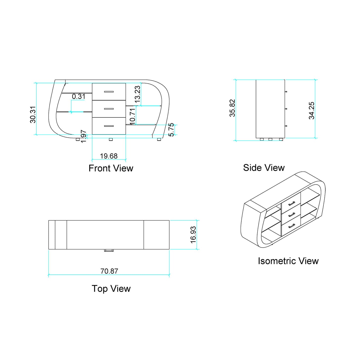 - Spacious Storage: Features open shelves and three storage drawers for ample organization