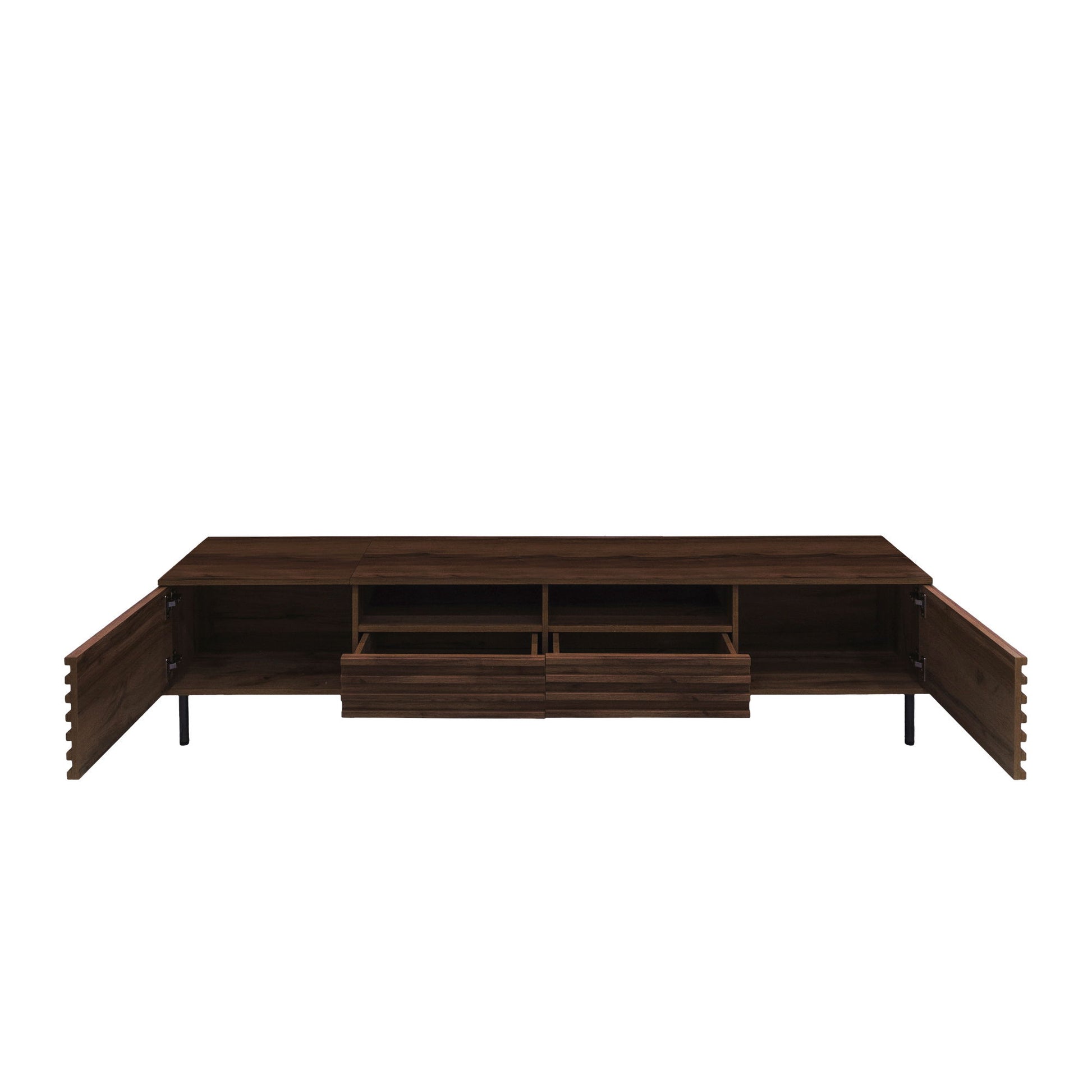 - Organized Entertainment Hub: Multiple slatted doors offer discreet storage, combining aesthetic texture with practical organization for media and accessories.