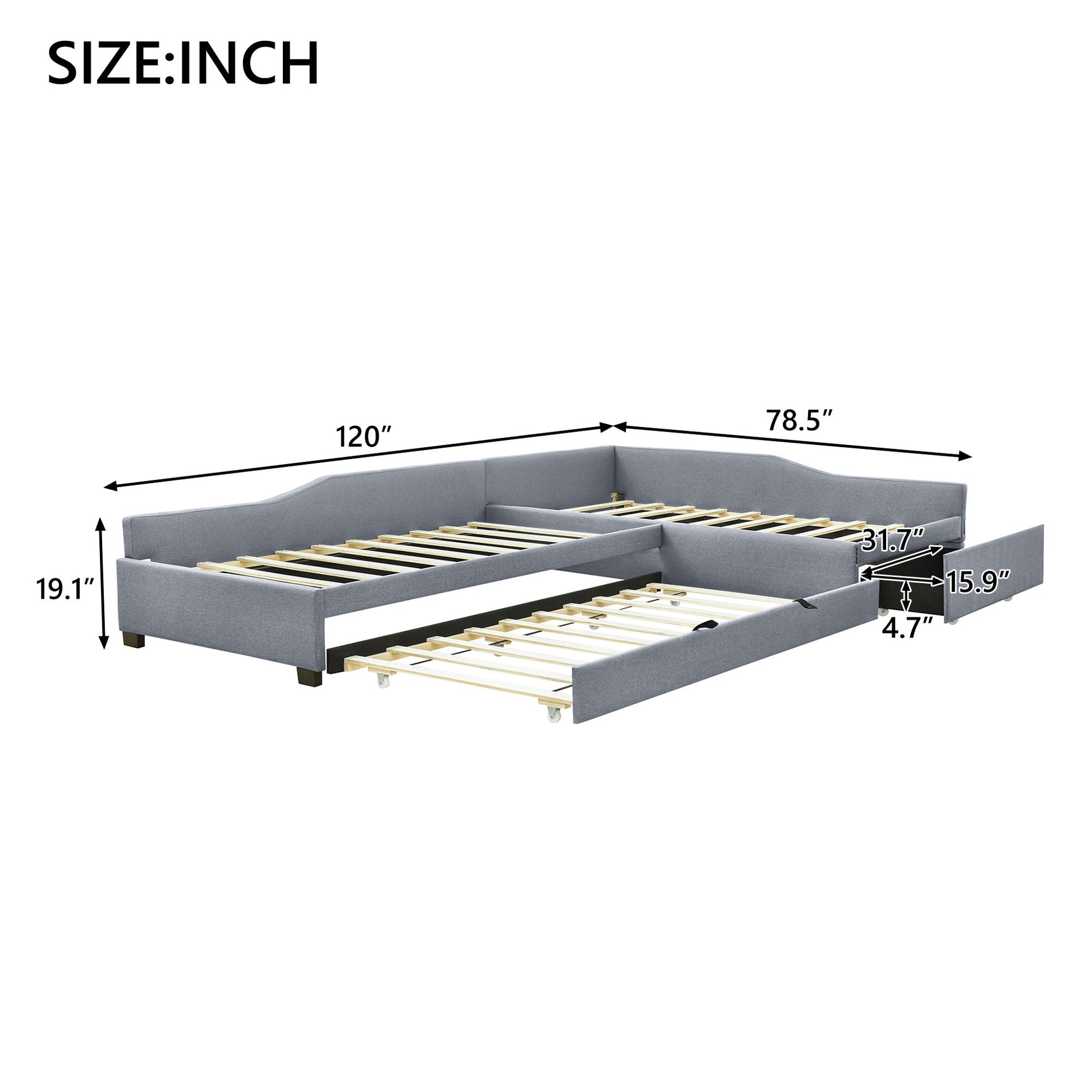 Upholstered Double Twin Daybed With Trundle And Drawer - Gray