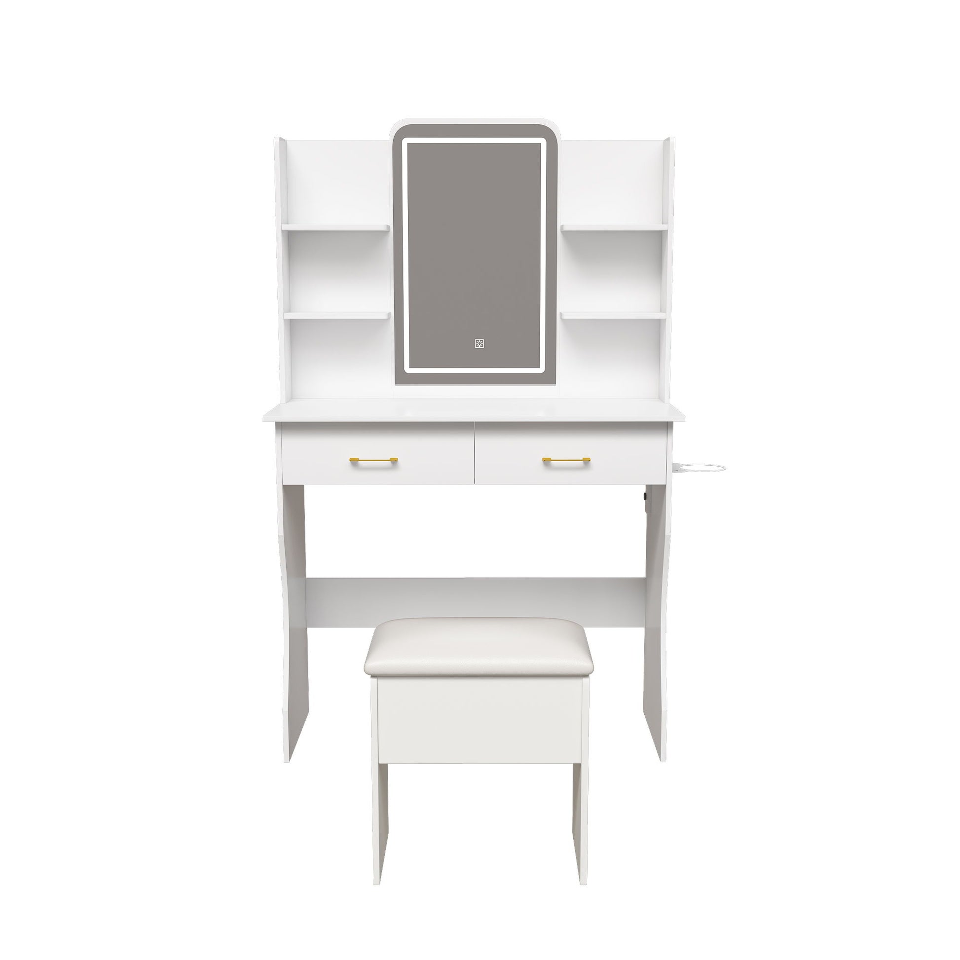 Vanity Desk With LED Lights Mirror, Power Outlet, Storage Drawers & Chair - White